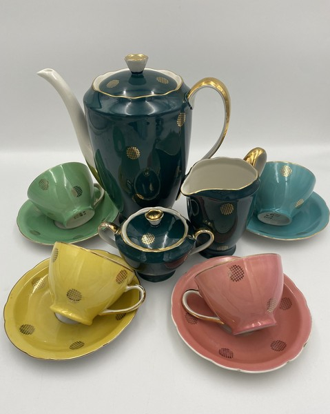 Serwis kawowy Ćmielów – lata 60. – kolorowy „New Look”, złote kropki.